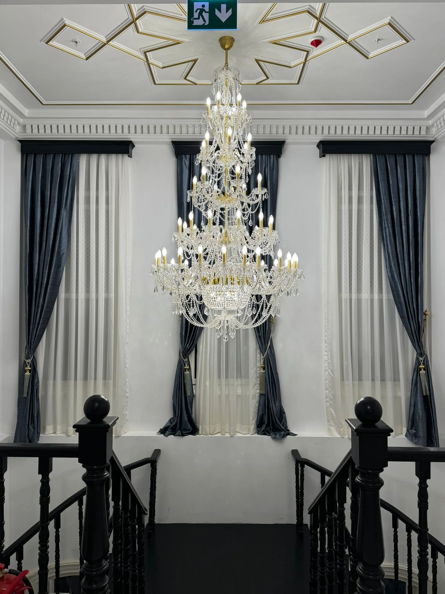 The centerpiece is a dramatic Ricamente Decorado chandelier in the double-height stairwell—Ø 130 × H 230 cm with 60 lights cascading through tiers of pure Czech crystal. Matching Ø 80 cm versions continue through the corridors. The executive office features our Finesse chandelier (Ø 140 × H 200 cm, 27 lights) with coordinating wall sconces, while the meeting rooms showcase the Aristocratico (Ø 130 × H 180 cm, 20 lights). The resting quarters are lit by our Imperial chandelier (Ø 86 × H 100 cm, 18 lights).