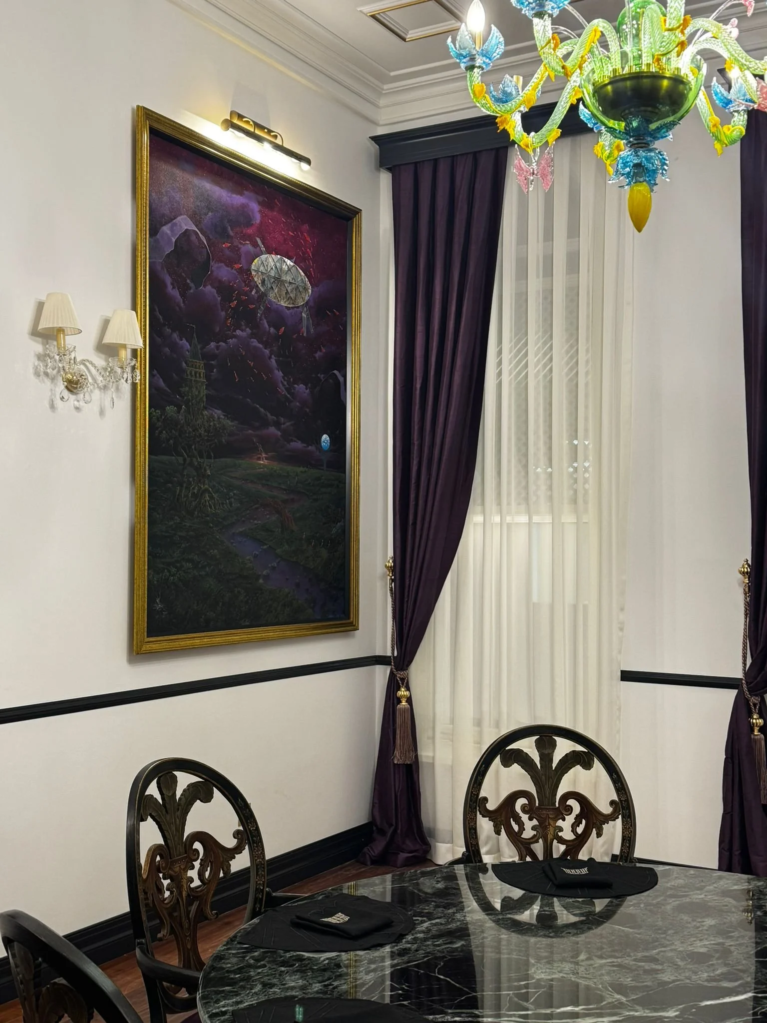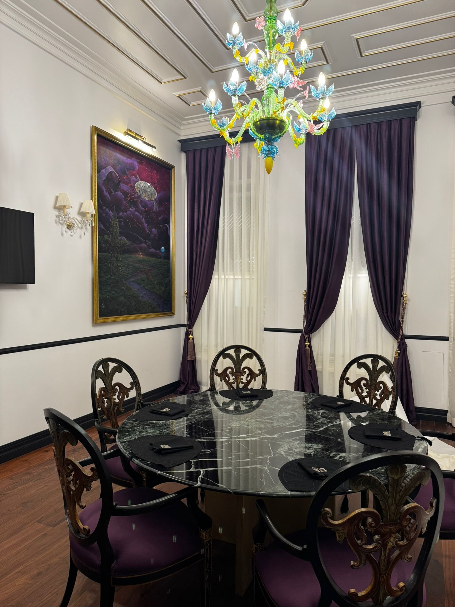 In the formal dining room, we introduced an unexpected contrast—a Murano-inspired Meadow chandelier (Ø 88 × H 110 cm) with hand-blown glass flowers in vibrant greens, blues, and yellows against the refined marble and velvet space. Coordinating table lamps and wall fixtures complete the collection throughout the building.