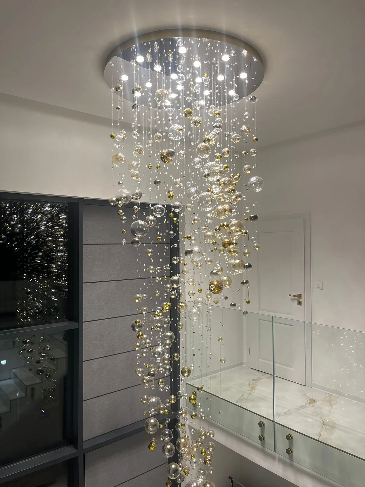 We designed this custom crystal chandelier with hand-blown glass bubbles for a client’s private villa entryway. The chandelier features hundreds of bubbles in golden and smoky tones that cascade down in a spiral shape from a stainless steel base.