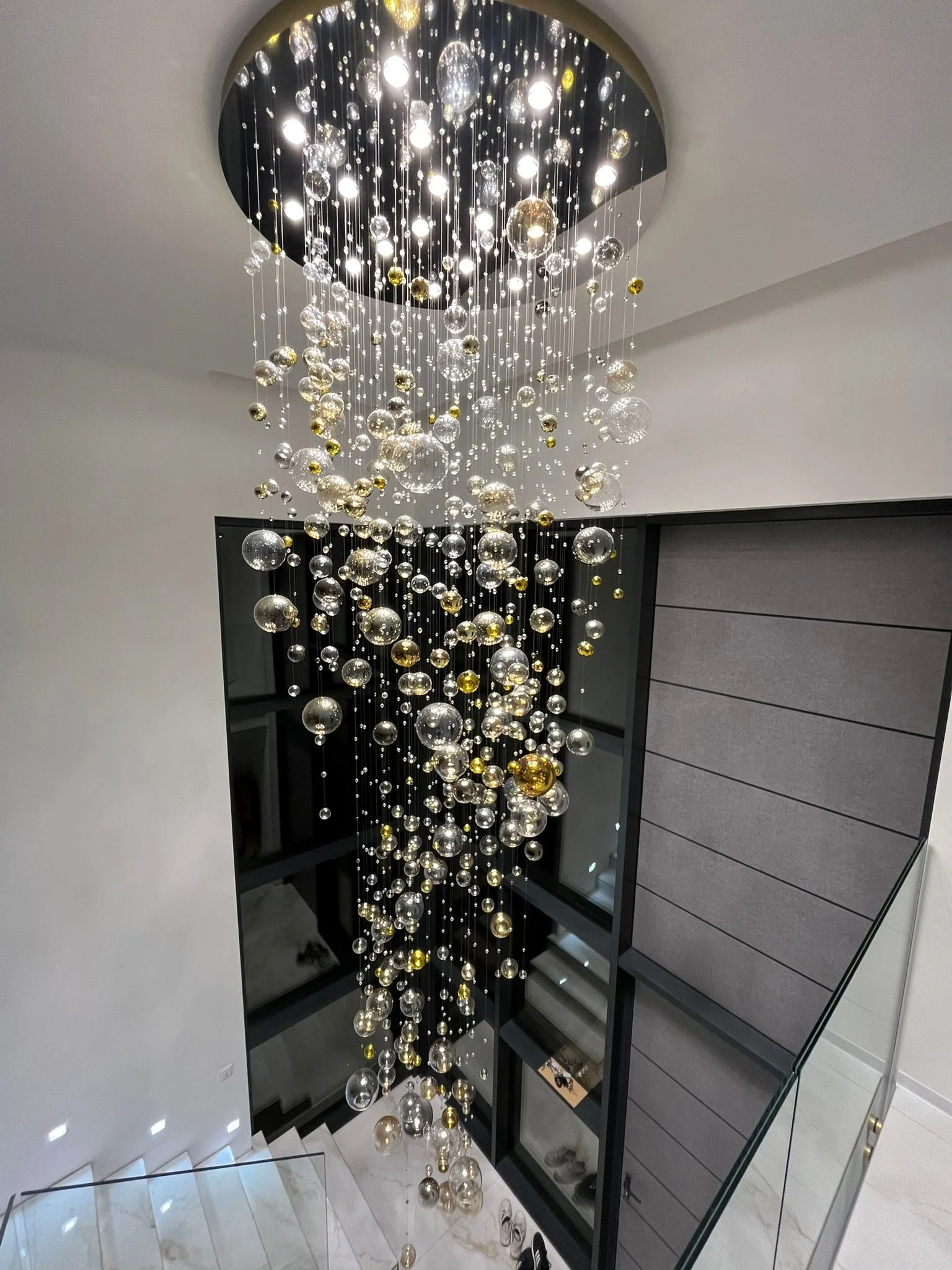 The chandelier measures 120cm in diameter and 330cm in height, filling the double-height space above the staircase.